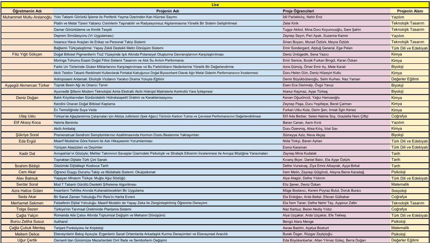 Yarışmalara katılan öğrenci ve projelerine ait bilgiler aşağıdaki listede yer almaktadır.